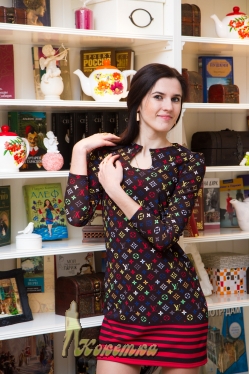 Модное платье расцветки Louis Vuitton с вырезом в виде капли на груди.